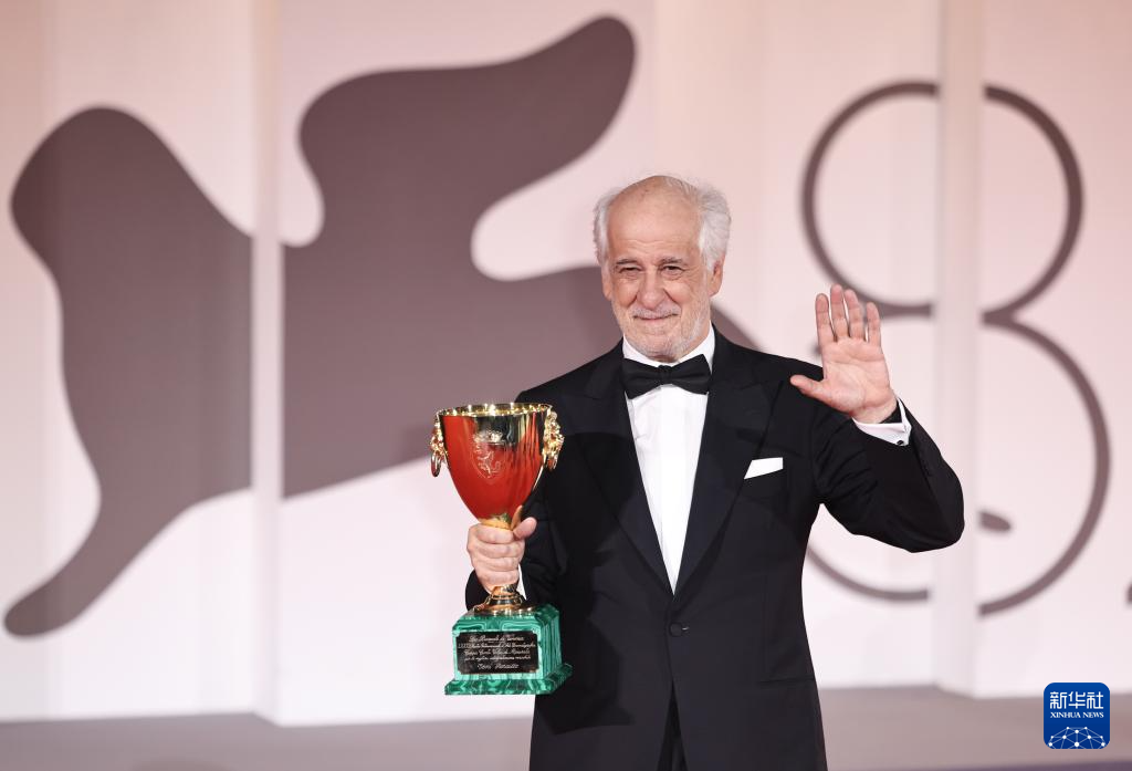 9月6日,在意大利威尼斯,最佳男演员奖获得者、电影《恩典》演员托尼·瑟维洛与奖杯合影。