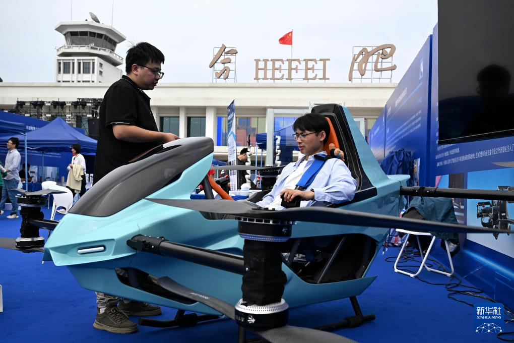 9月21日,观众在“全空间无人体系成果展”上体验一款无人驾驶飞行摩托。