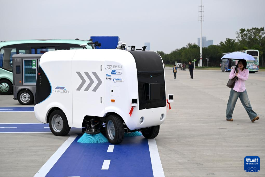 9月21日,观众在“全空间无人体系成果展”上参观一款纯电动无人扫路机。
