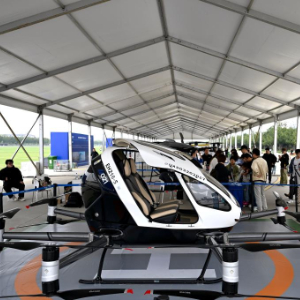 9月21日,观众在“全空间无人体系成果展”上参观一款无人驾驶电动垂直起降航空器。