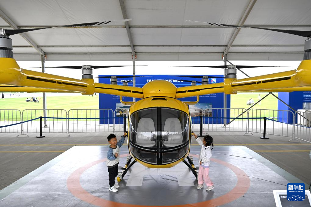 9月21日,小朋友在“全空间无人体系成果展”上参观一款无人驾驶电动垂直起降航空器。