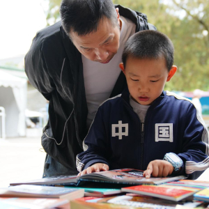 9月22日,小朋友在家长陪同下在地坛书市上挑选书籍。