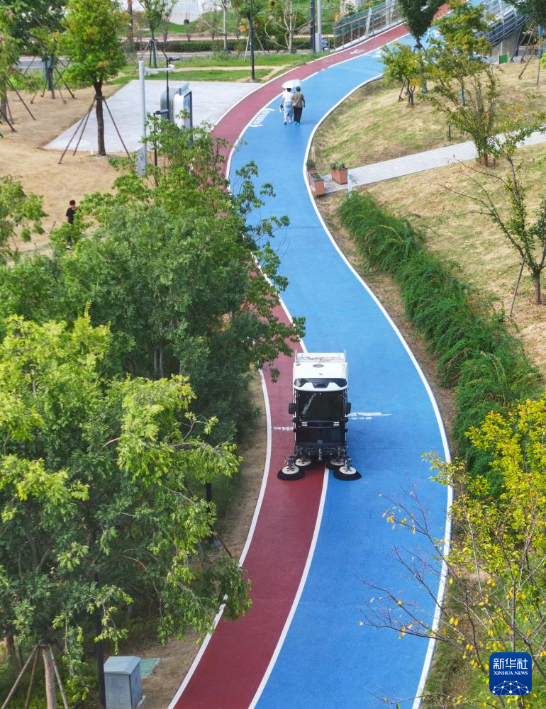 无人驾驶清扫车在南京市雨花台区的数据线公园路面上作业(9月22日摄,无人机照片)。