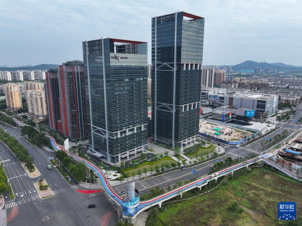 市民行走在南京市雨花台区的数据线公园“空中廊桥”(9月22日摄,无人机照片)。