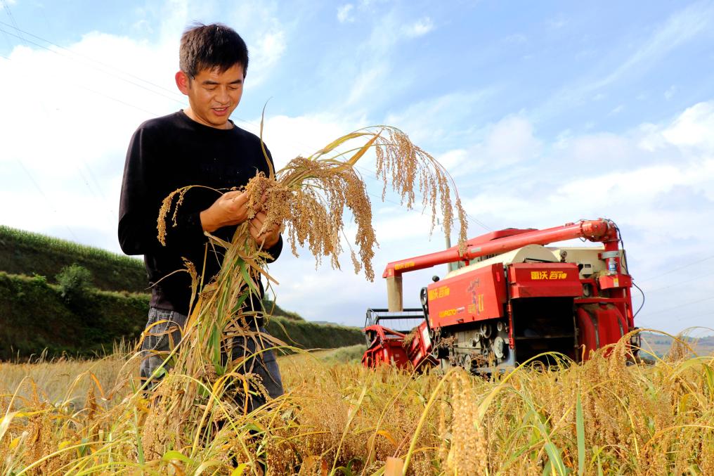 9月22日,在甘肃省平凉市静宁县城川镇咀头村,村民查看糜子生长情况。