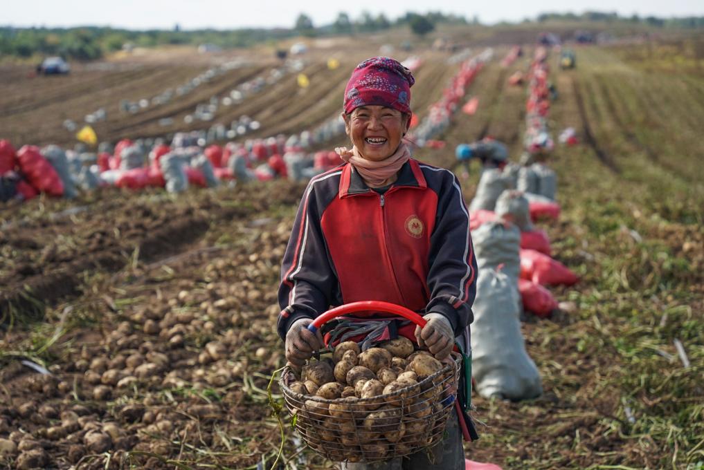 9月22日,河北省承德市围场满族蒙古族自治县御道口镇农民在田间展示收获的马铃薯。