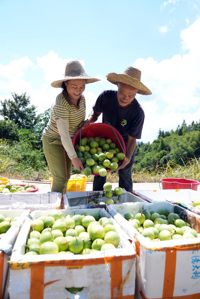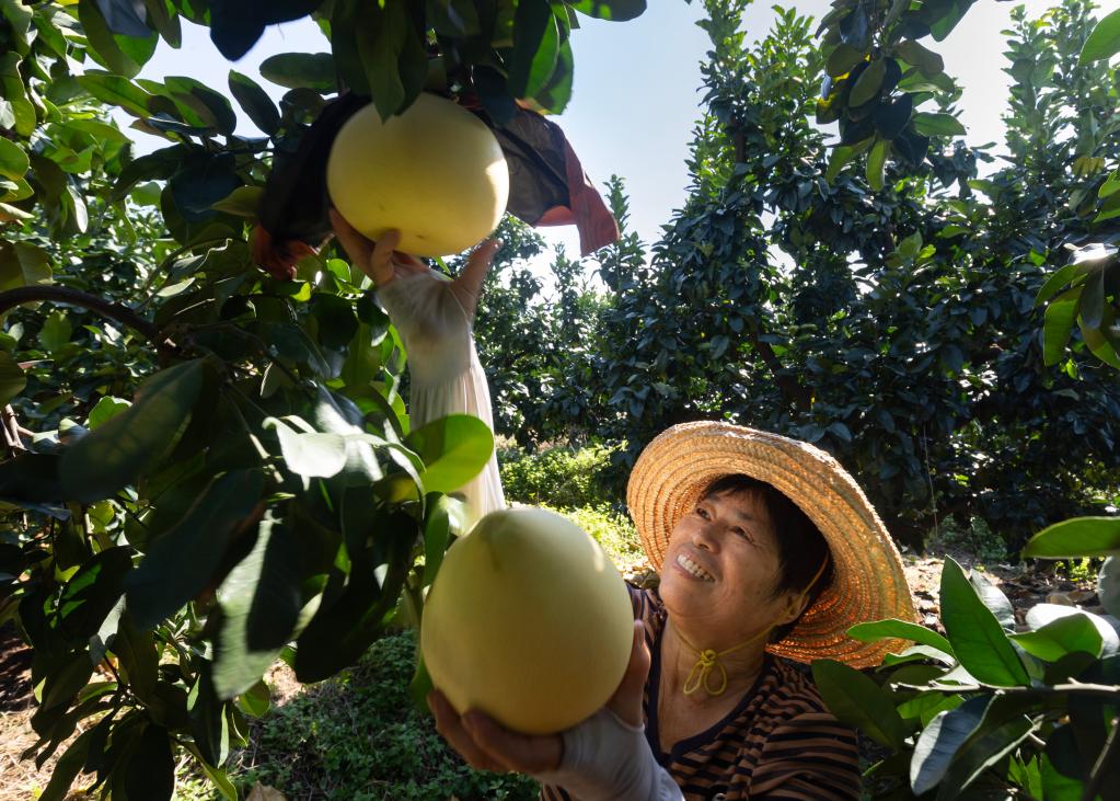 9月22日,在福建省平和县,果农在柚子园里采摘蜜柚。