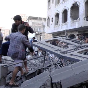 9月25日,在也门首都萨那,人们在遭袭地点附近搜救。