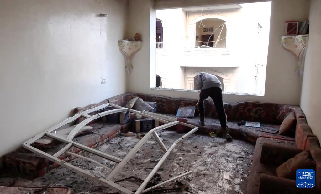 9月25日,在也门首都萨那,一名男子查看在空袭中损毁的房屋。