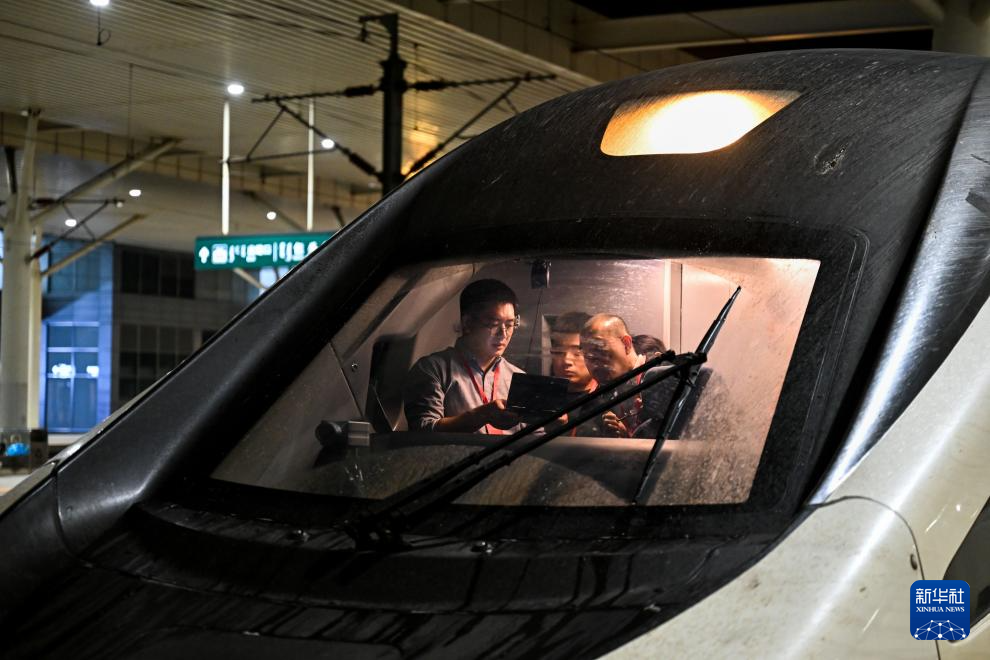 9月27日,工作人员在55601次试验列车外检查车体外观。