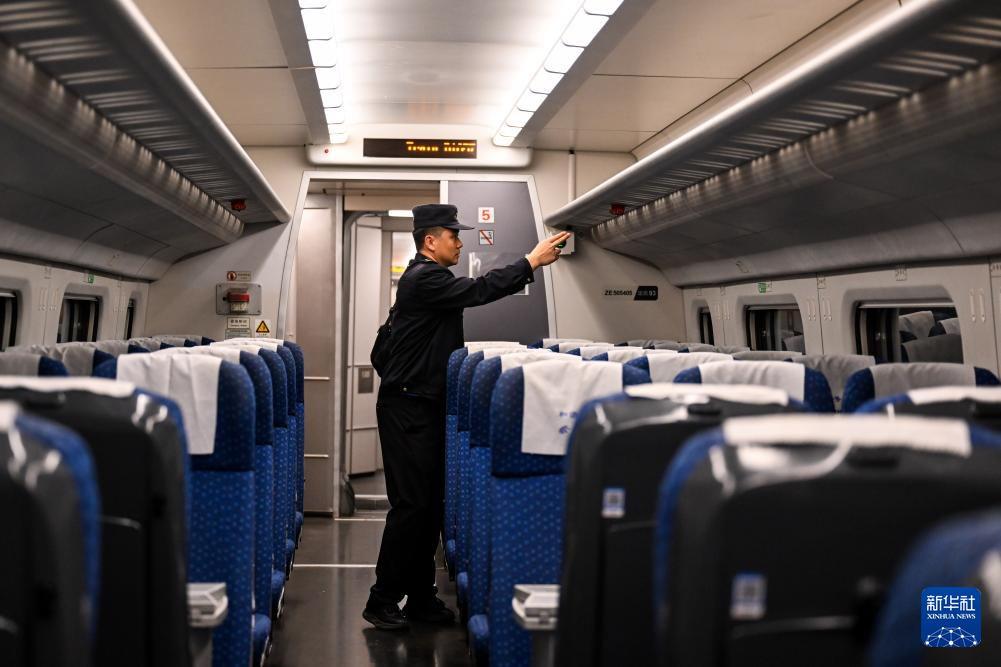 9月27日,工作人员在55601次试验列车上进行车内巡视作业。