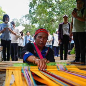 9月27日,一名当地村民在景迈山大平掌古茶园为游客展示织锦技艺。