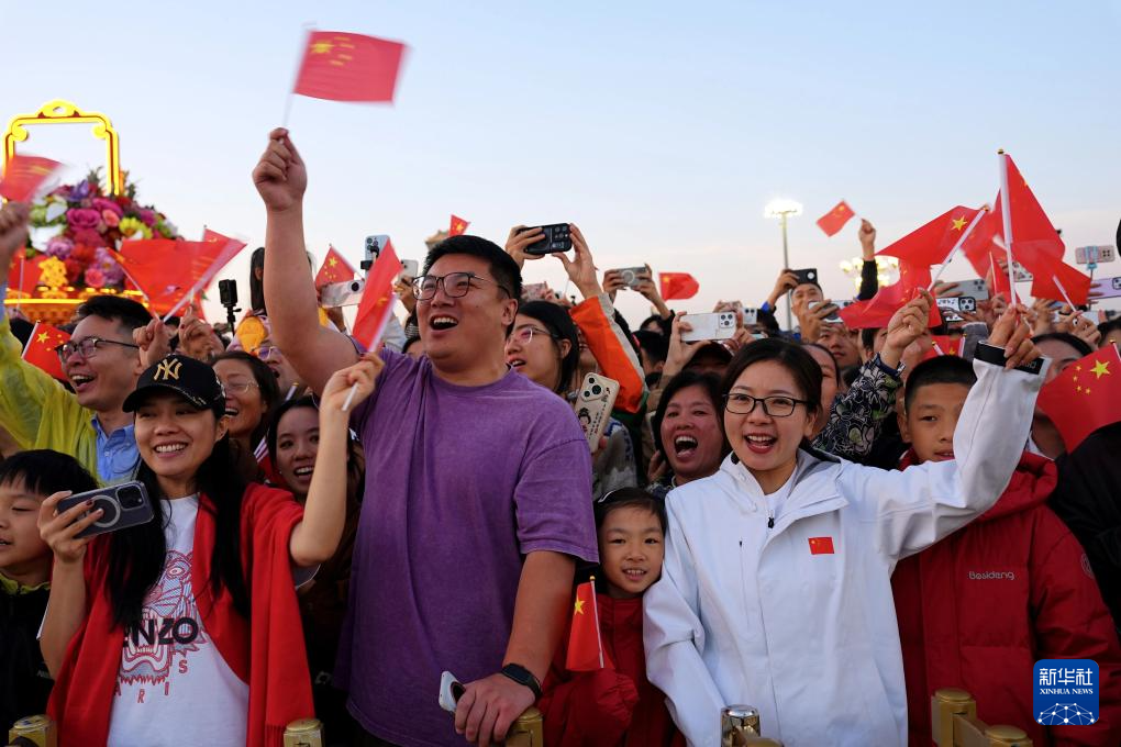 10月1日清晨,隆重的升国旗仪式在北京天安门广场举行,庆祝中华人民共和国成立76周年。这是观众在升旗仪式后欢呼。