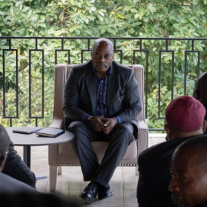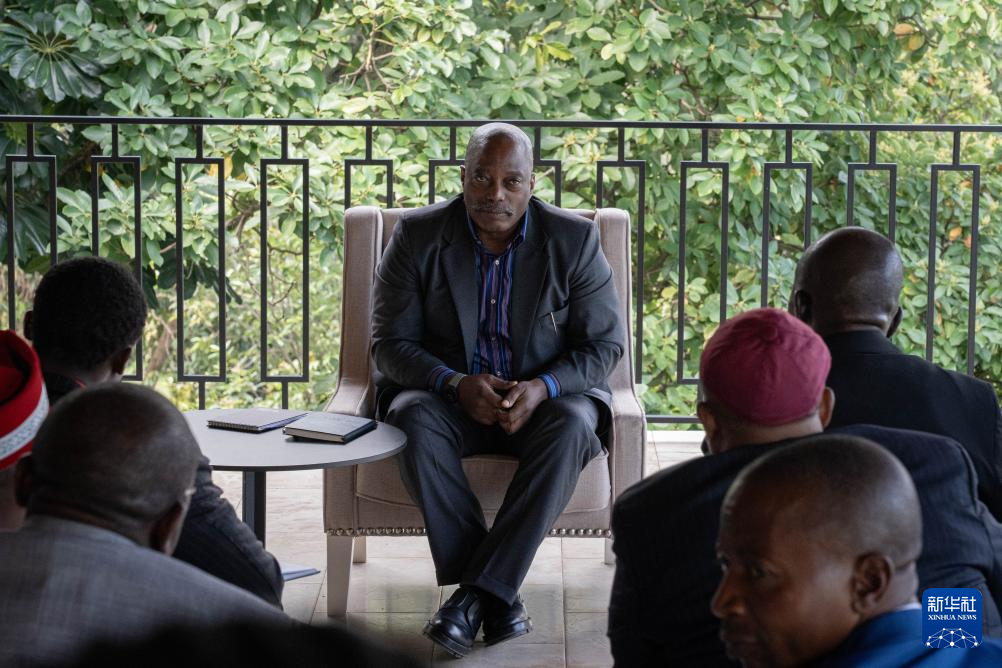 这张2025年5月29日拍摄的资料照片显示的是,刚果(金)前总统约瑟夫·卡比拉(中)在该国北基伍省首府戈马市会见当地人士。
