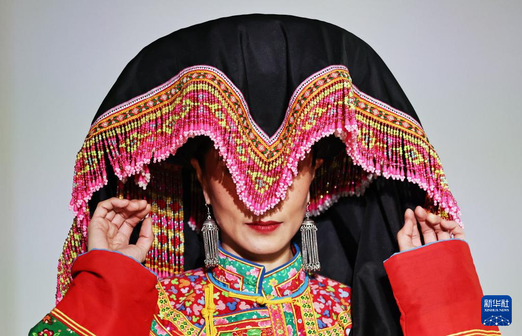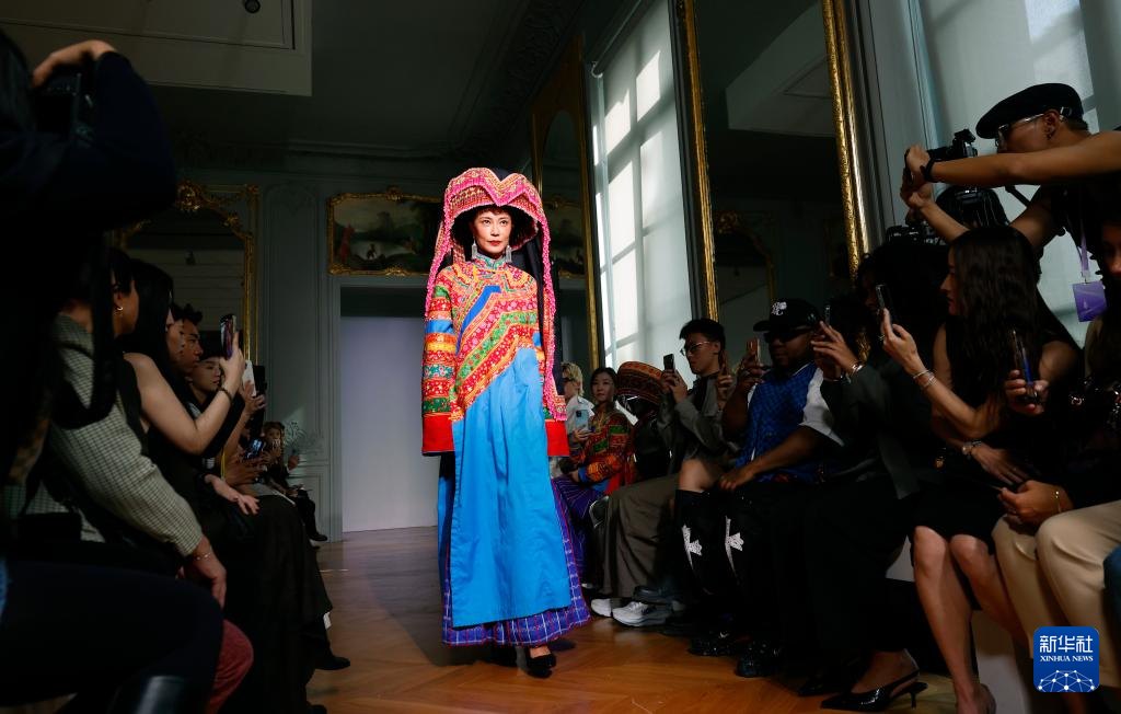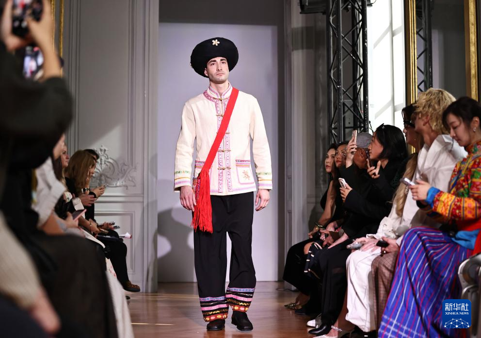 10月1日,在法国巴黎中国文化中心举行的第三届中法时装周上,模特在“非遗四川·百城百艺”盐边·傈僳族服饰时尚秀上展示服装。
