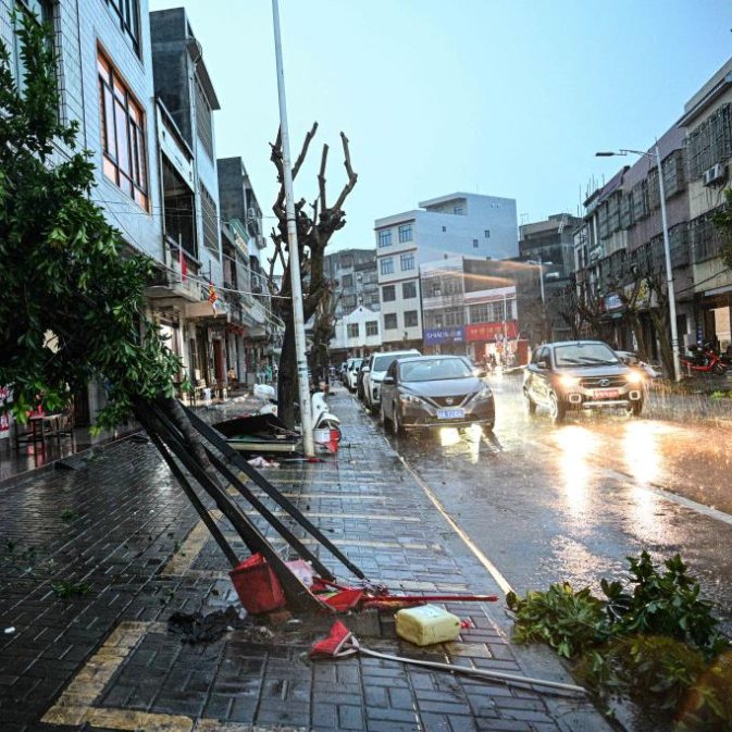 10月5日在海南省文昌市翁田镇一家商店外拍摄的在台风中被吹倒打碎的啤酒瓶。