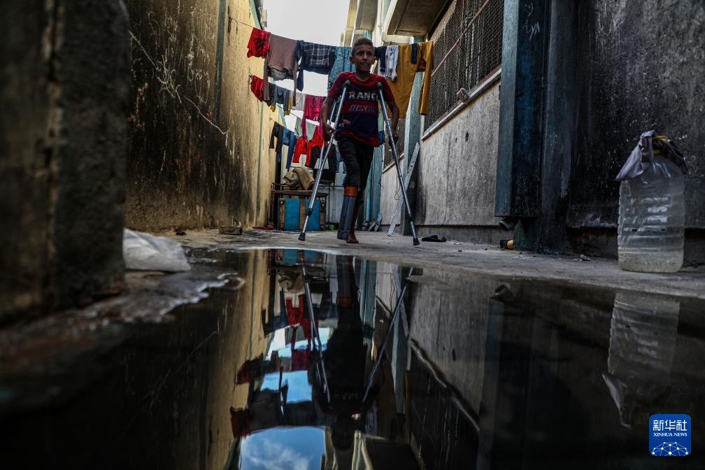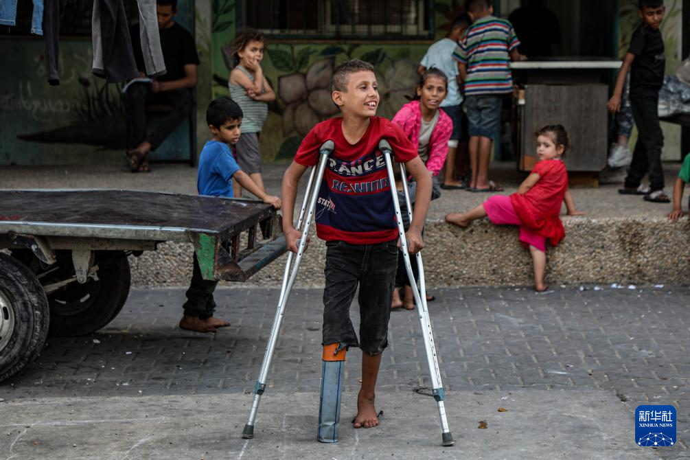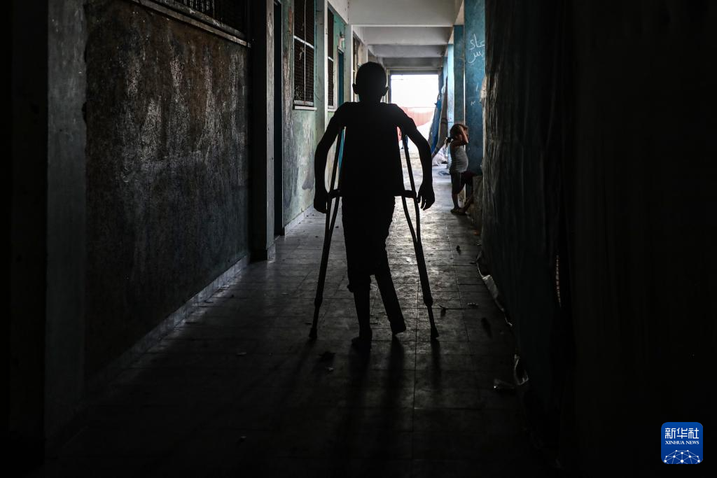 10月5日,年仅10岁的少年拉提卜·阿布·卡里克在加沙地带中部代尔拜拉赫附近的联合国临时安置机构内拄着拐杖行走。在数月前的一次以色列空袭中,拉提卜失去了右腿致残,他的母亲和兄弟也在袭击中身亡。