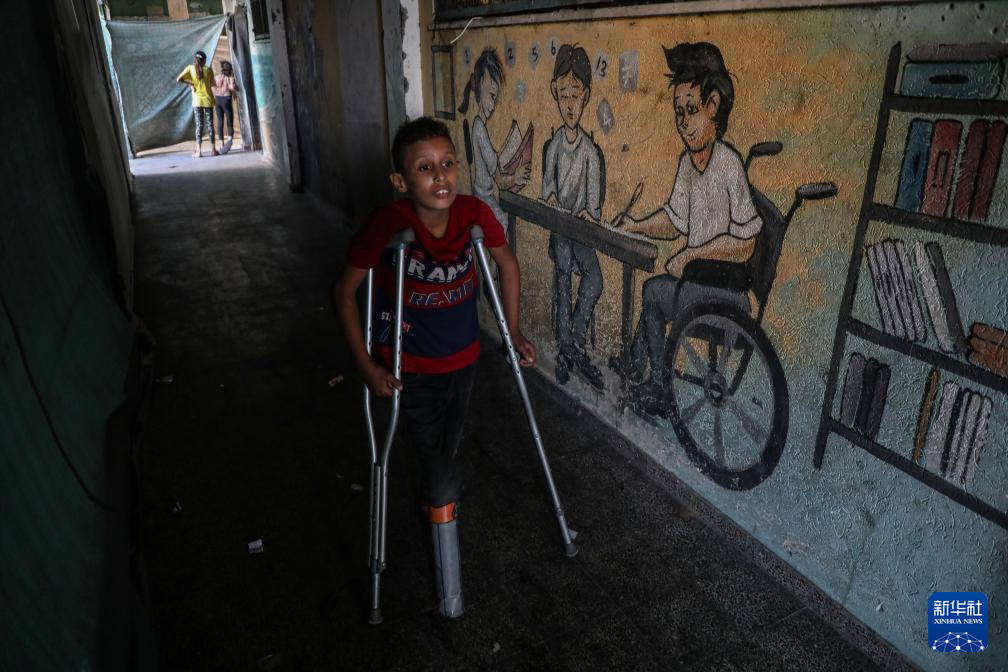 10月5日,年仅10岁的少年拉提卜·阿布·卡里克在加沙地带中部代尔拜拉赫附近的联合国临时安置机构内拄着拐杖安装假肢。在数月前的一次以色列空袭中,拉提卜失去了右腿致残,他的母亲和兄弟也在袭击中身亡。