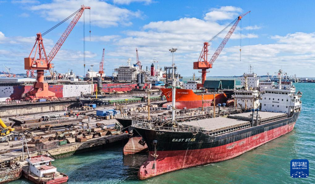 10月14日,在山东省荣成市石岛管理区修造船产业基地,工人们在加紧工作(无人机照片)。