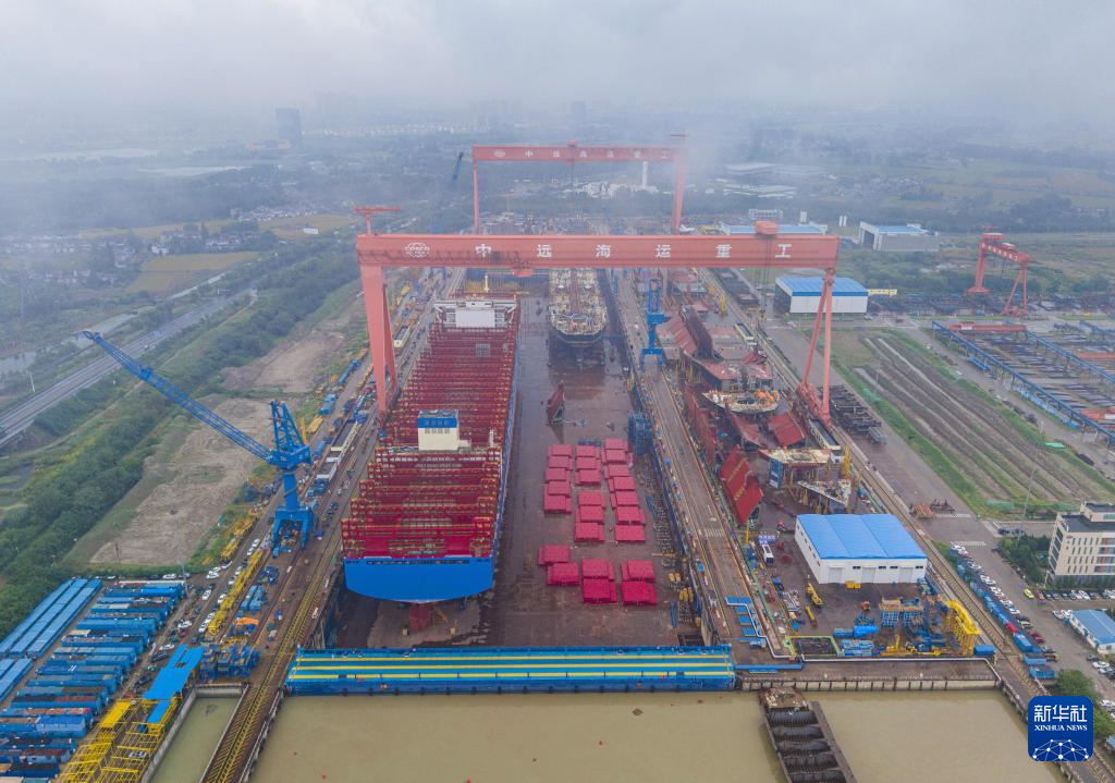 10月14日拍摄的位于江苏省泰兴市的江苏扬子鑫福造船有限公司船坞内建造的大型船舶(无人机照片)。