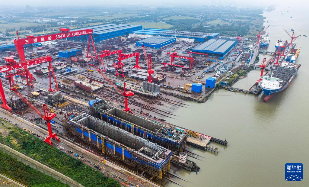 10月14日,在位于江苏省泰州市高港区的泰州三福船舶工程有限公司生产基地,多艘大型船舶正在建造中(无人机照片)。