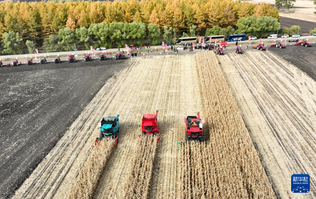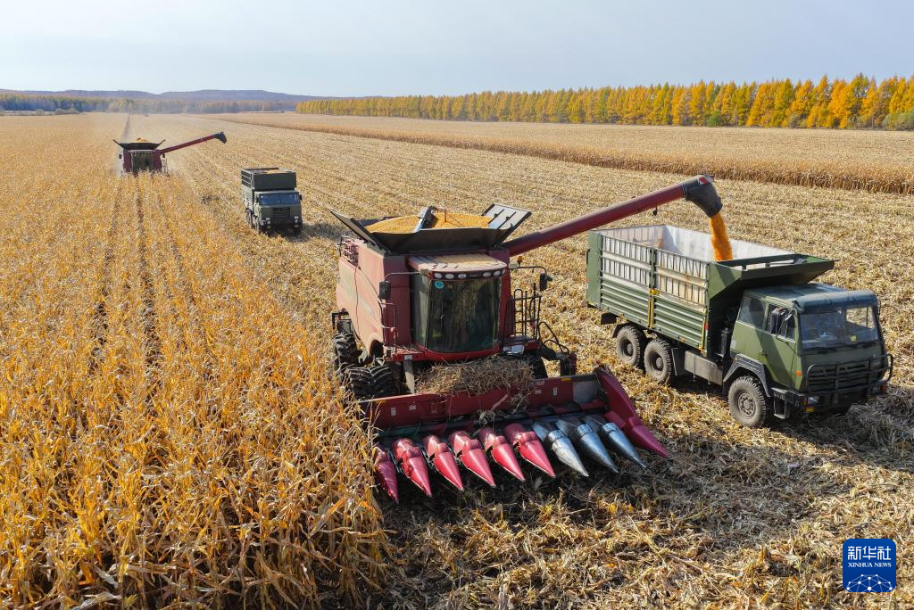 10月13日,在北大荒集团黑龙江格球山农场有限公司玉米地块,大型农机在进行抢收作业(无人机照片)。