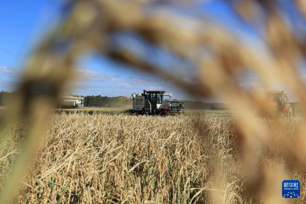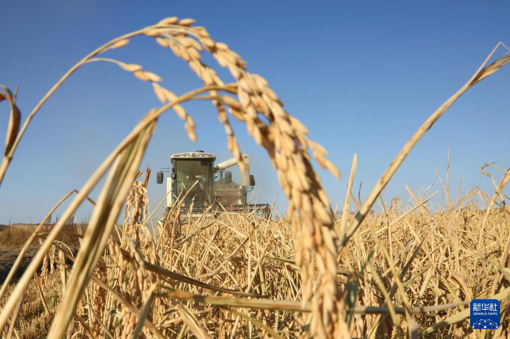 10月13日,在北大荒集团黑龙江建设农场有限公司第四管理区,种植户驾驶收割机抢收水稻。