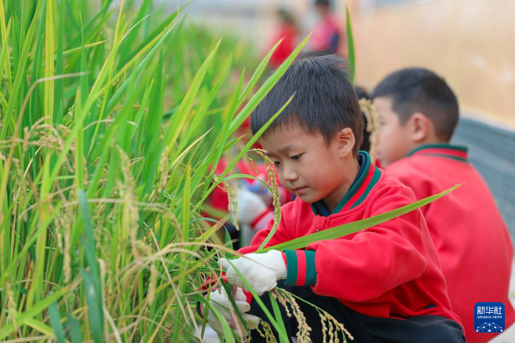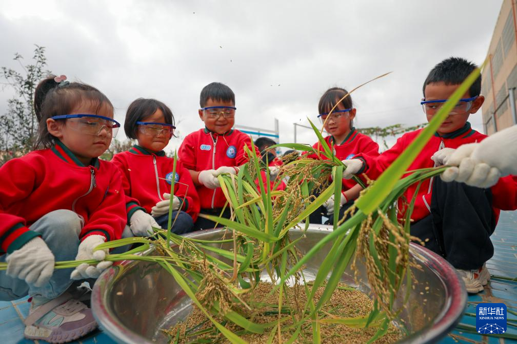 10月15日,云南省曲靖市陆良县大莫古镇中心幼儿园的孩子们在校内劳动基地体验打稻穗。