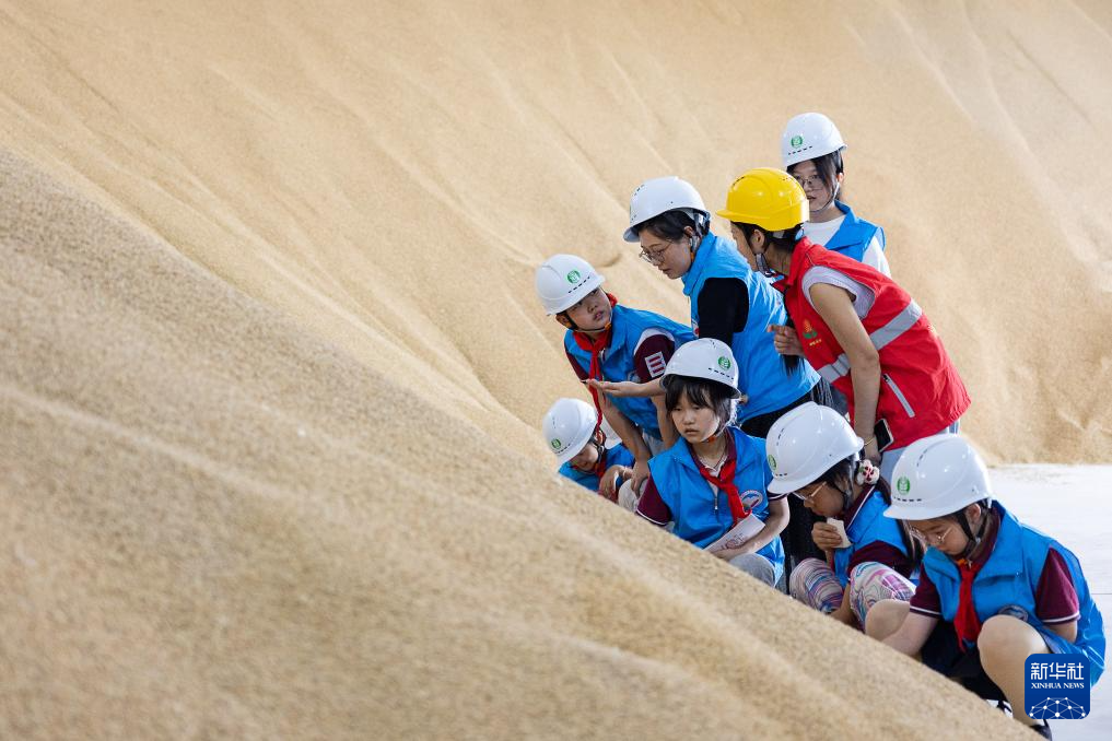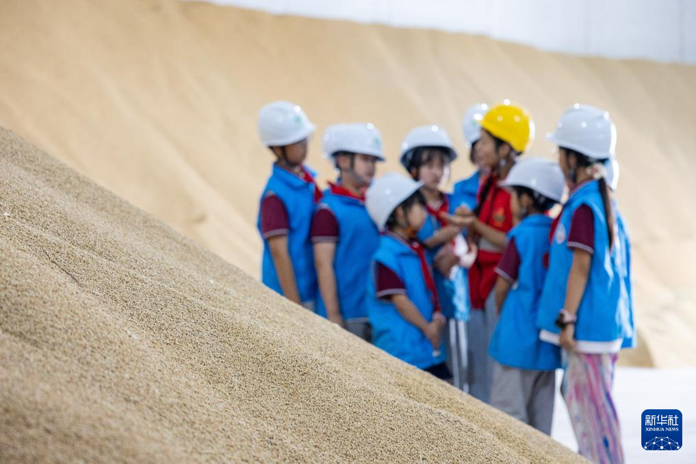 10月16日,在浙江省湖州市中心粮库,工作人员向学生讲解粮食储备知识。