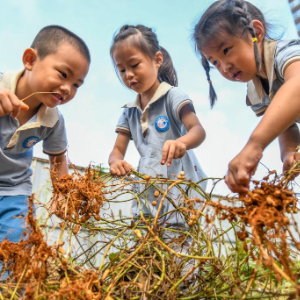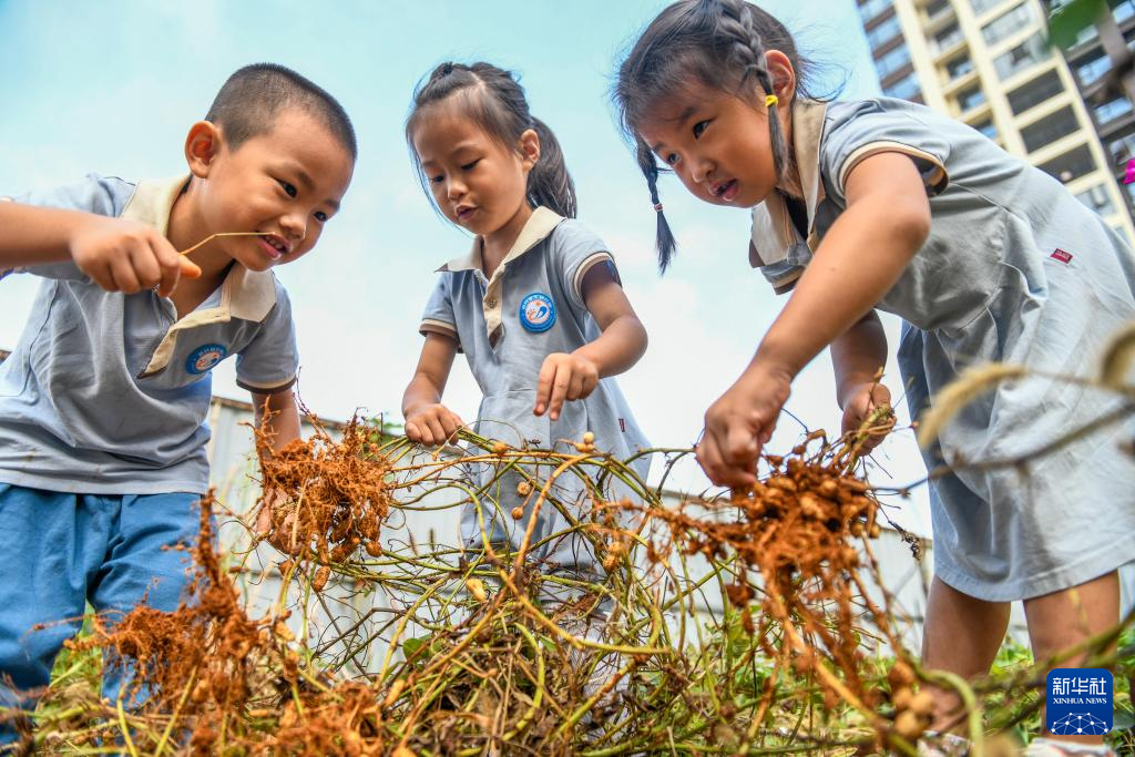 10月15日,在湖南省永州市道县城东幼儿园,小朋友在体验采收花生。