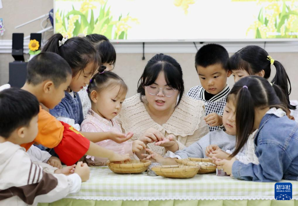 10月16日,在湖南省永州市道县城南幼儿园,老师带着孩子们了解各类粮食知识。