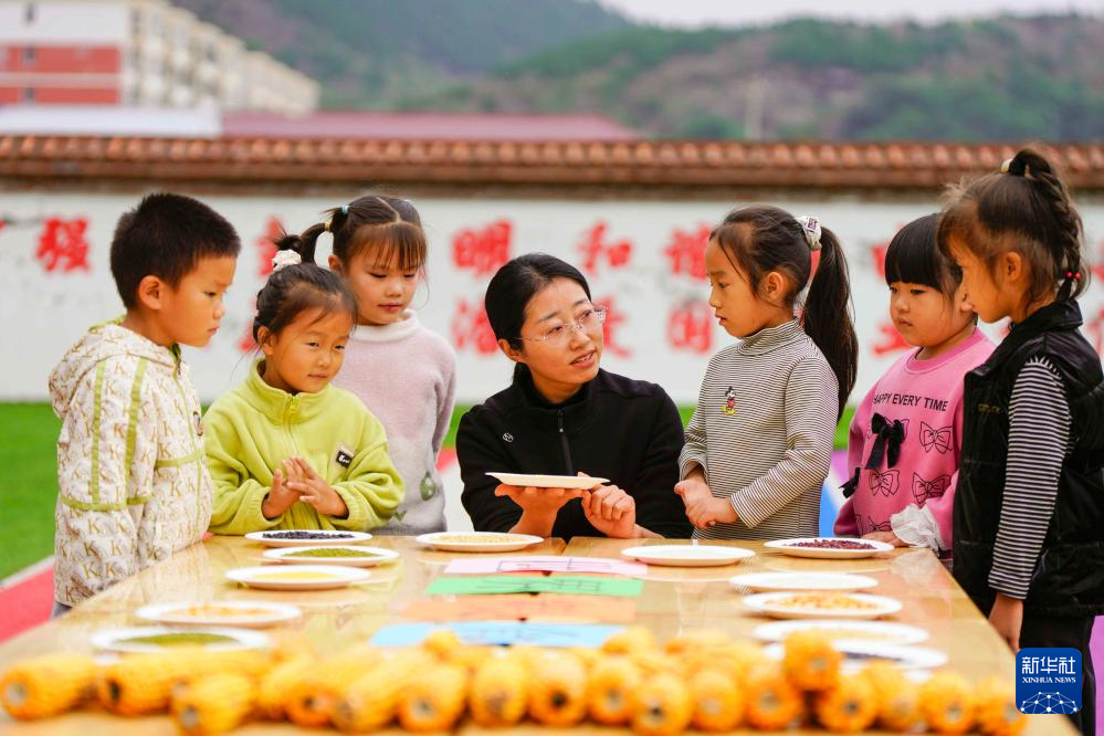 10月16日,云南省丽江市幼儿园的老师给孩子们讲解各类粮食知识。