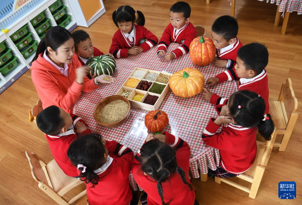 10月16日,河北省遵化市地北头镇鲁家峪幼儿园的老师为小朋友讲解各类粮食知识。