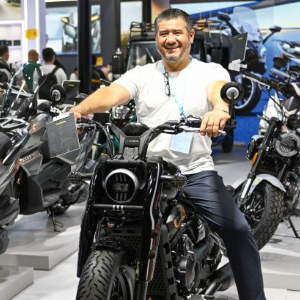 10月19日,客商在138届广交会展馆摩托车展区与摩托车产品合影留念。