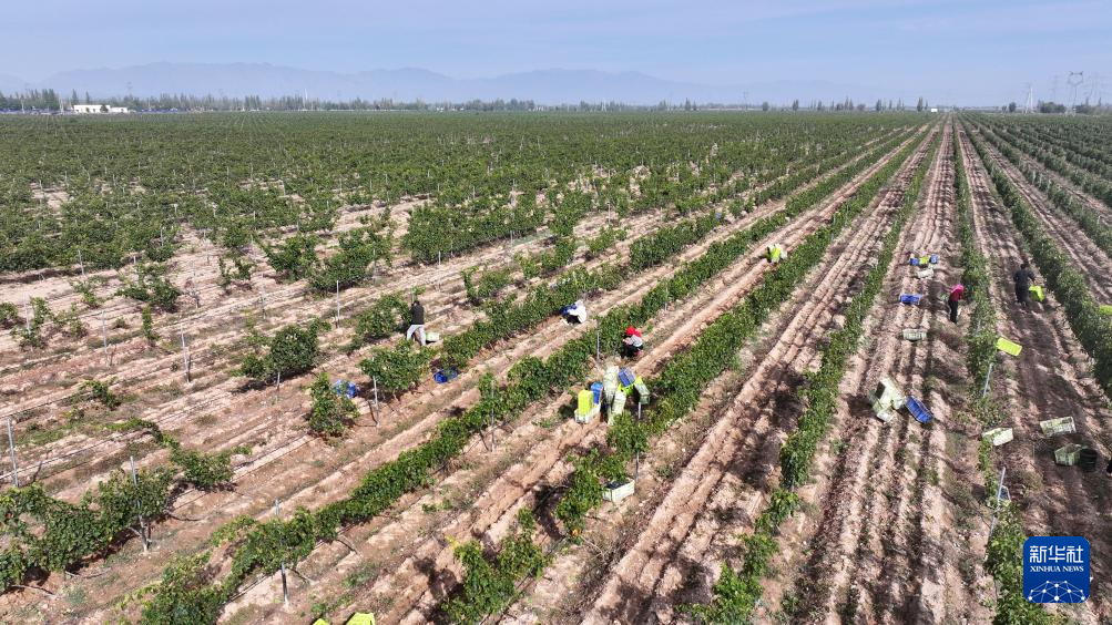 农户在银川市永宁县闽宁镇葡萄地里采摘酿酒葡萄(无人机照片,10月14日摄)。