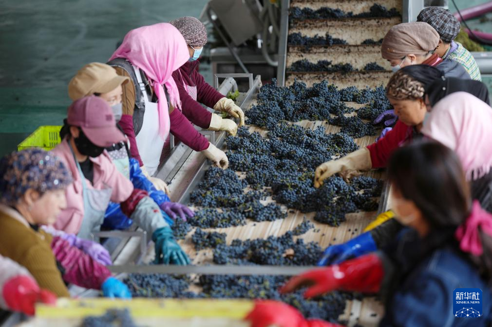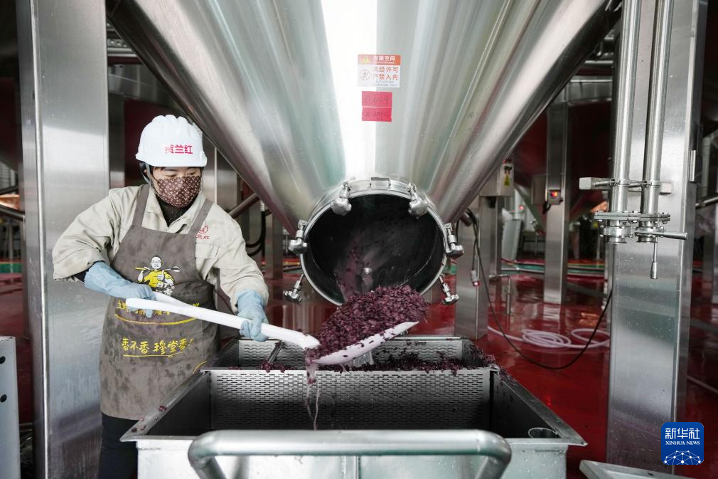 工作人员在银川市永宁县闽宁镇的贺兰红酒庄对酿酒葡萄进行压榨处理(10月14日摄)。