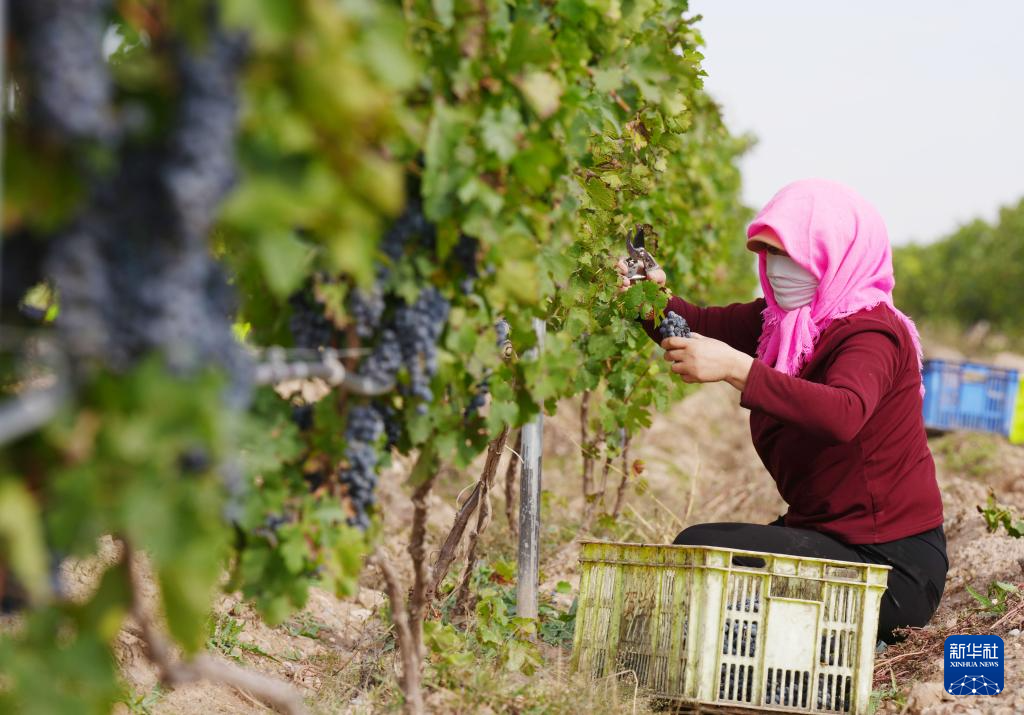 农户在银川市永宁县闽宁镇葡萄地里采摘酿酒葡萄(10月14日摄)。