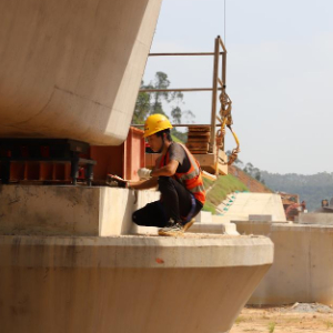 10月19日,在广东省佛山市高明区的新村大桥架梁现场,工人在查看落梁状态。