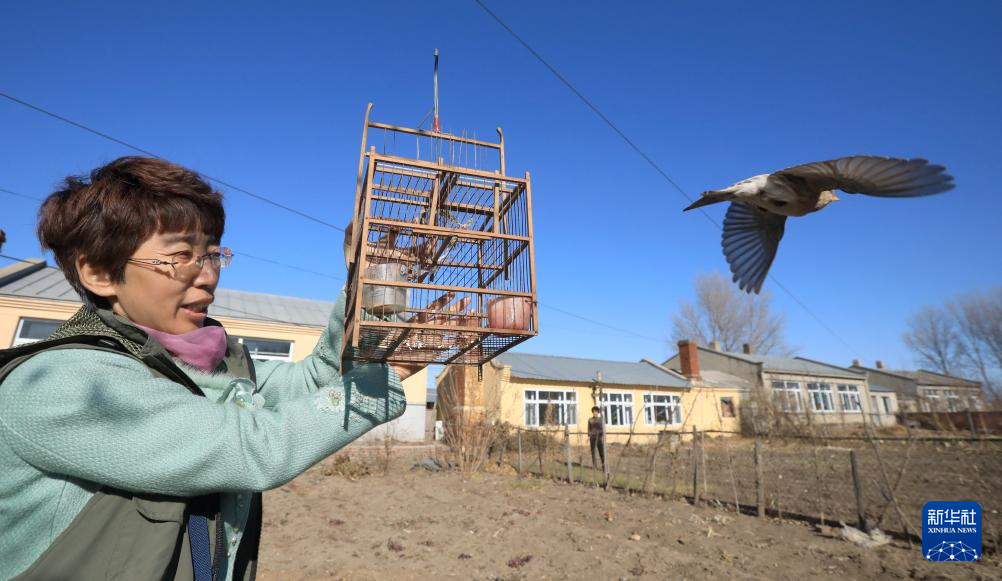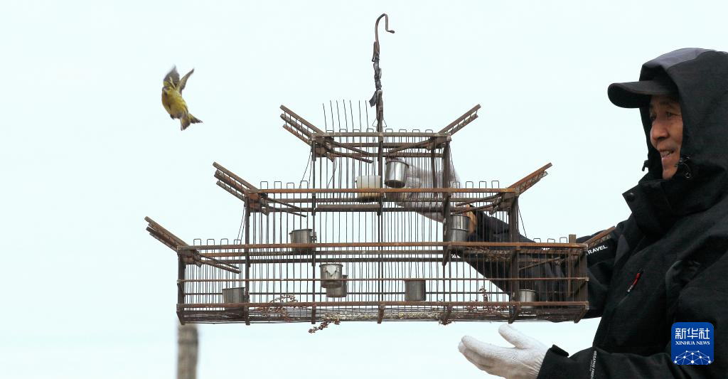 哈尔滨野保志愿者团队志愿者放飞被捕鸟笼捕获的鸟类(2023年11月4日摄)。