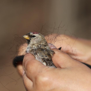 哈尔滨野保志愿者团队志愿者在剪掉缠在白腰朱顶雀身上的鸟网(2019年11月2日摄)。