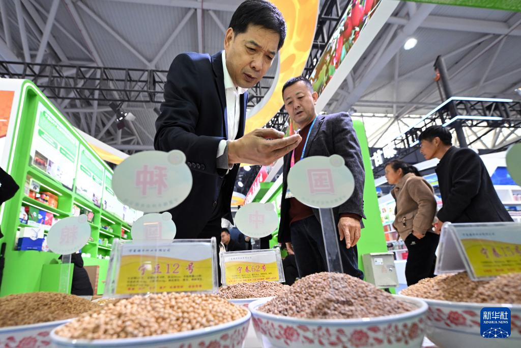 10月25日,参观者在杨凌农高会宁夏展位上了解作物种子。
