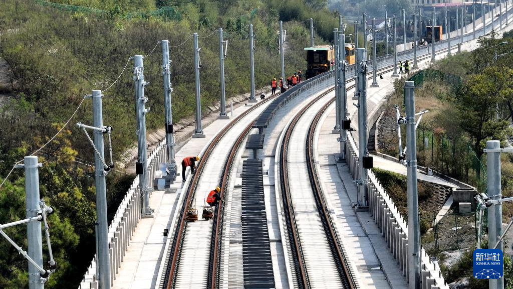 这是11月2日拍摄的杭德市域铁路三里塘基地钢轨焊接施工现场(无人机照片)。