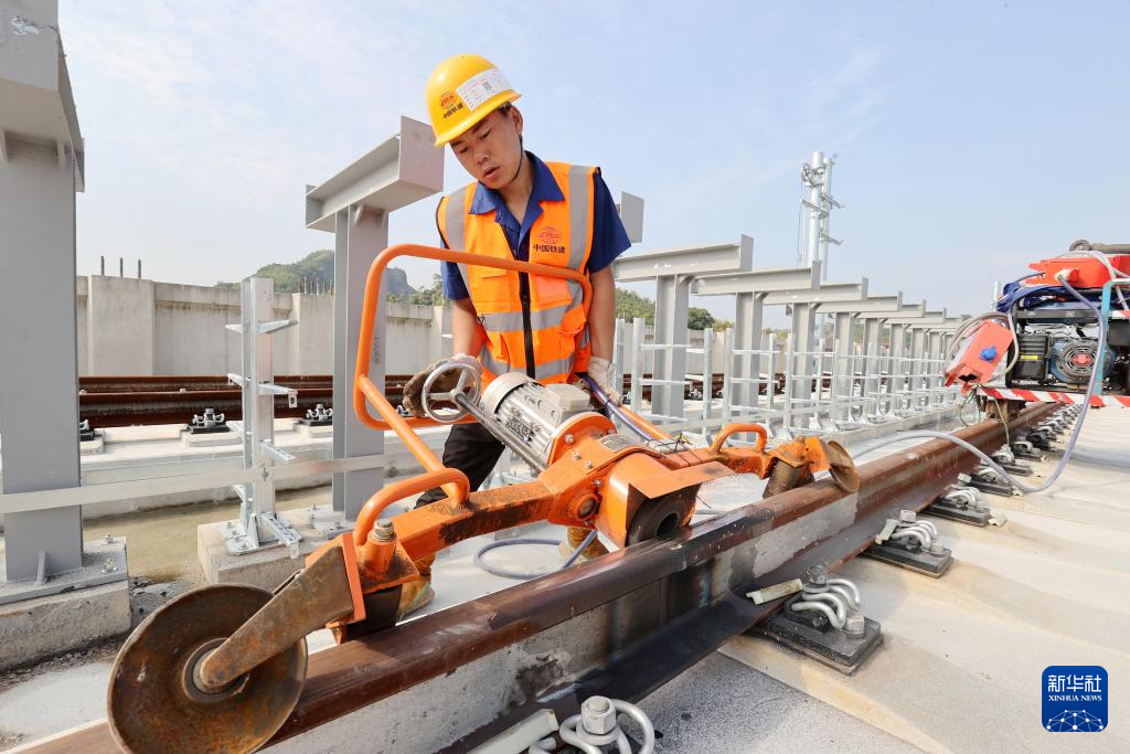 11月2日,中铁十一局工人在焊轨段打磨钢轨焊接处。
