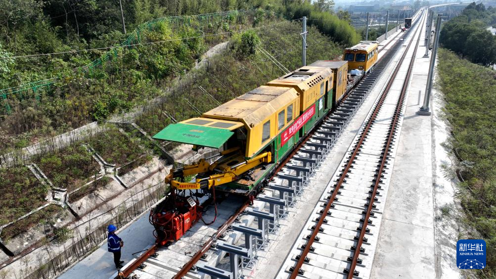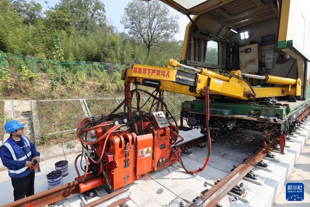 11月2日,位于浙江省湖州市德清县下渚湖街道的杭德市域铁路三里塘基地,中铁十一局工人操作新能源焊轨设备进行钢轨焊接作业。