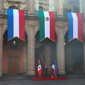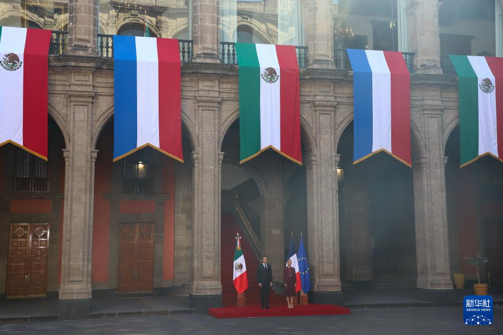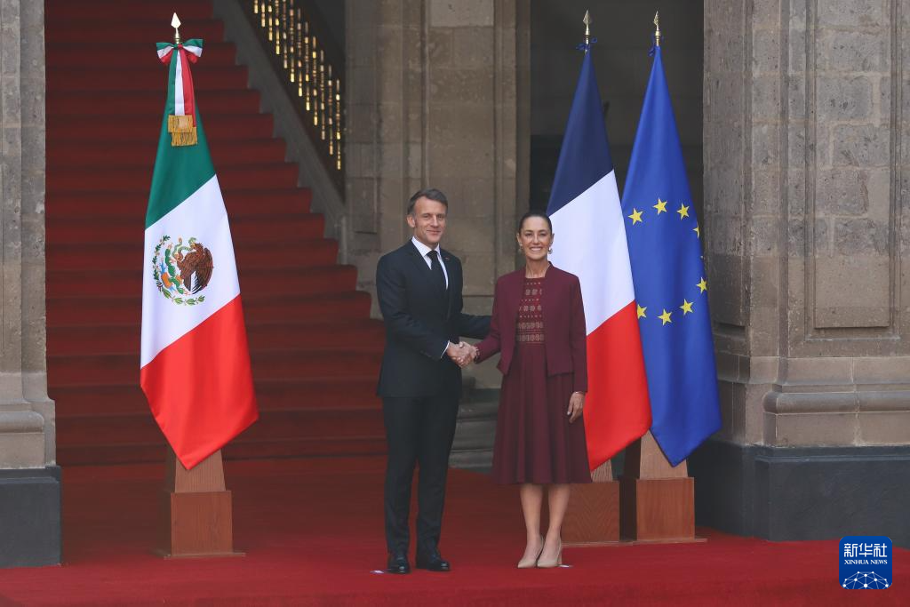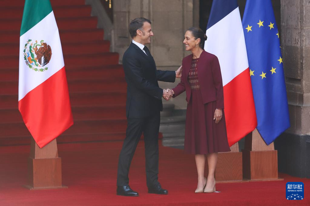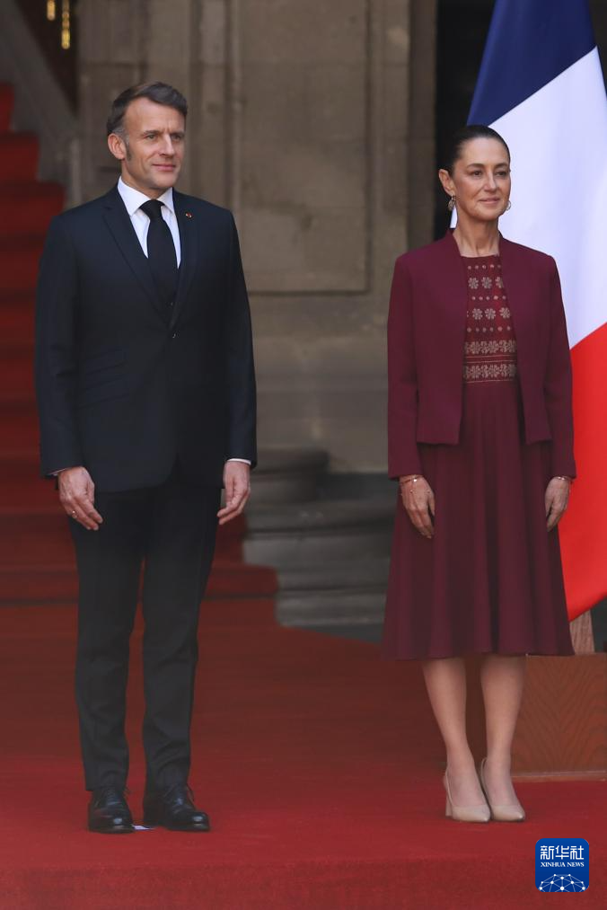 11月7日,在墨西哥首都墨西哥城,墨西哥总统辛鲍姆(右)举行仪式,欢迎到访的法国总统马克龙。