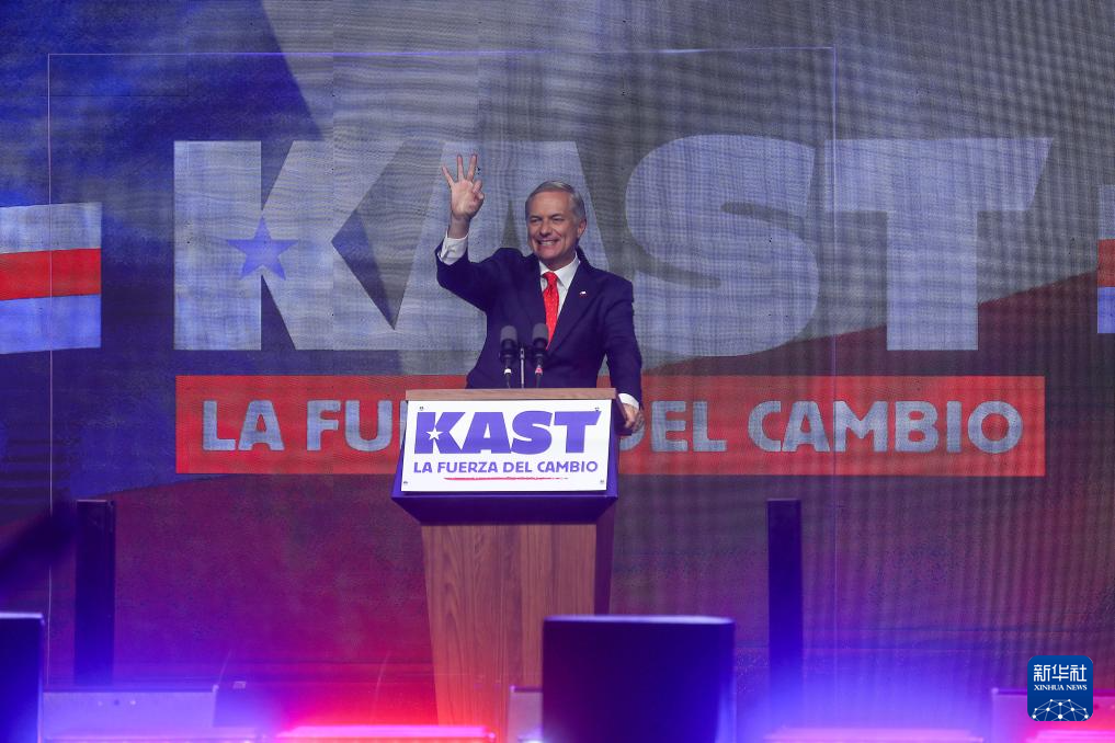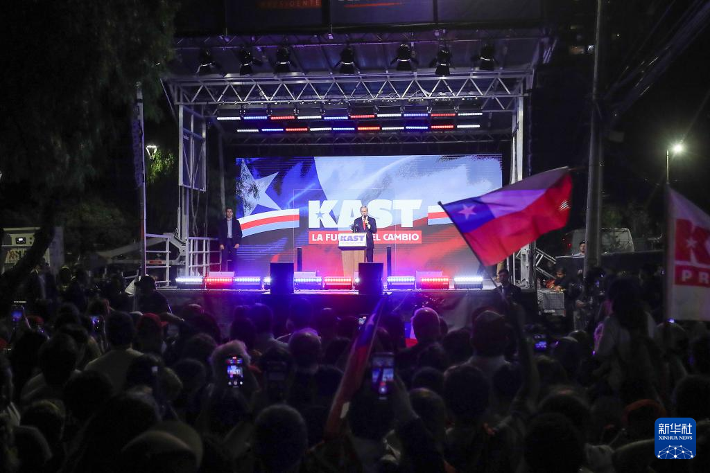 11月16日,在智利首都圣地亚哥,极右翼政党智利共和党候选人何塞·安东尼奥·卡斯特在确认进入总统选举第二轮投票后发表讲话。