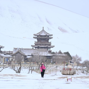 11月23日,受冷空气影响,甘肃省敦煌市迎来降雪,当地著名景点鸣沙山月牙泉银装素裹,美不胜收。