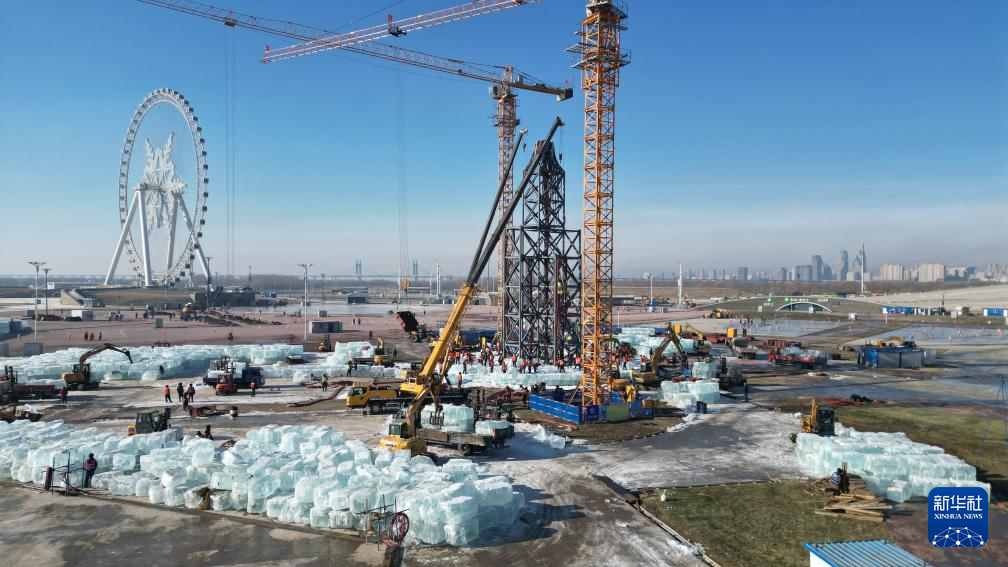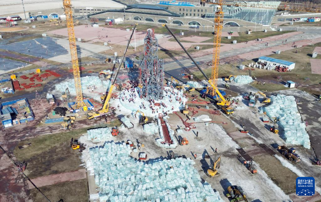 11月25日在黑龙江哈尔滨拍摄的第二十七届哈尔滨冰雪大世界冰建工程施工现场(无人机照片)。