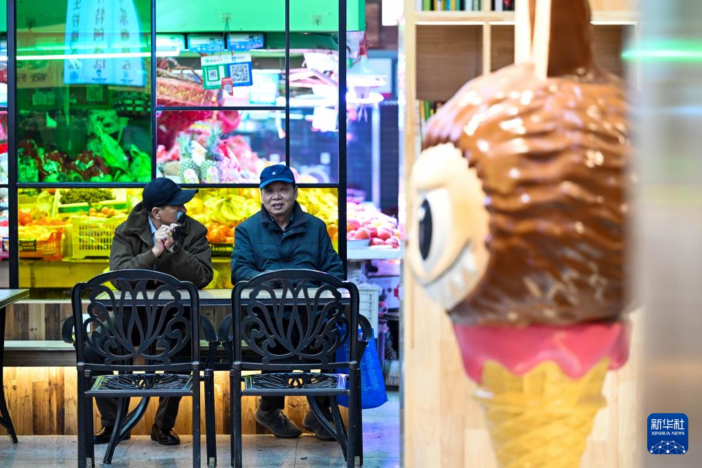 11月25日,市民在天津市河西区“美丽的菜市场”一处休闲区聊天。