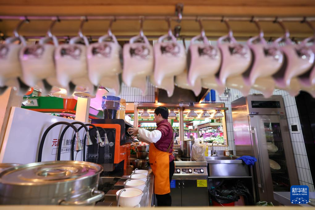 11月25日,天津市河西区“美丽的菜市场”内一家面档经营者在准备食材。